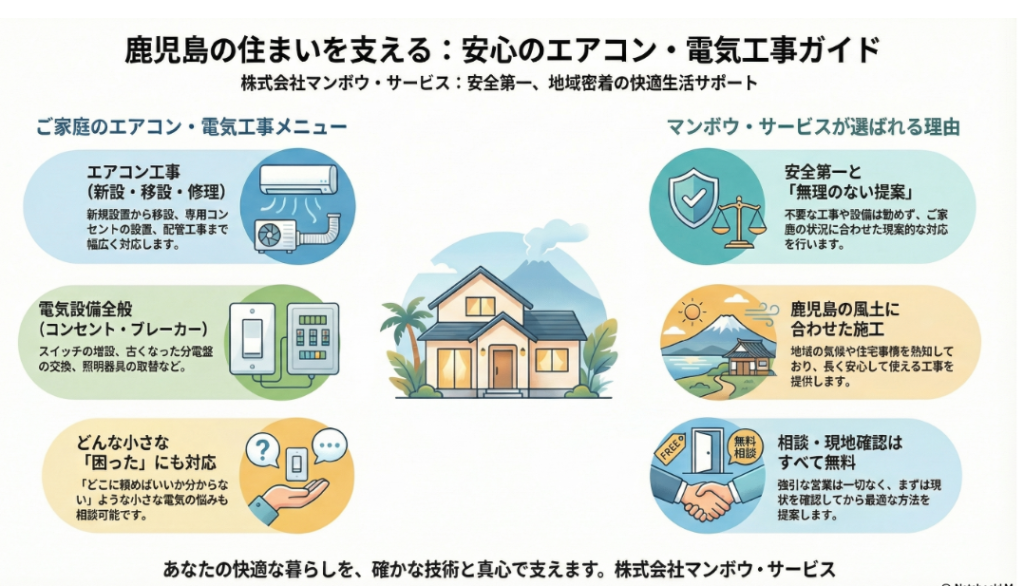当社では、鹿児島市内のご家庭向けに、 エアコン工事・空調工事・電気工事を一括対応しています。 小さな工事からでも、お気軽にご相談ください。