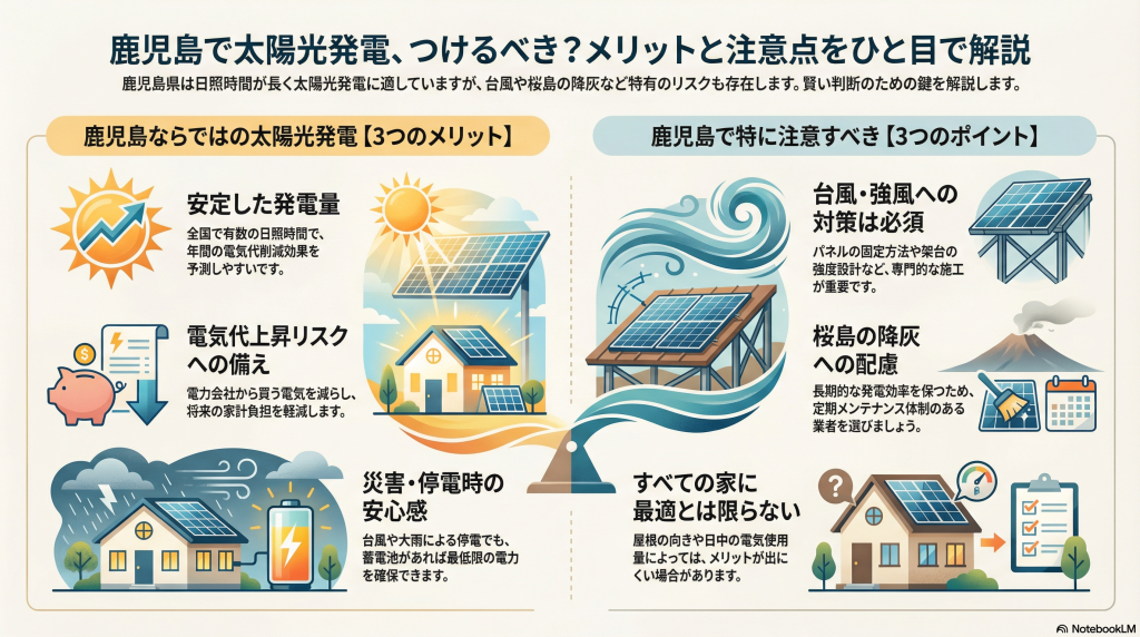 日照時間の長さという鹿児島の「強み」を最大限に活かし、台風や降灰という「リスク」を信頼できる施工と設計で封じ込める。このバランスこそが、後悔しない選択の鍵となります。