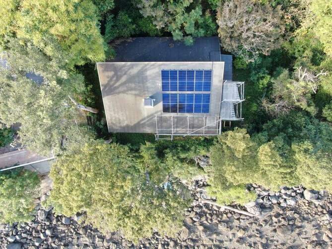 太陽光発電システムの設置工事では、ドローンで屋根の状況を細かく確認し、