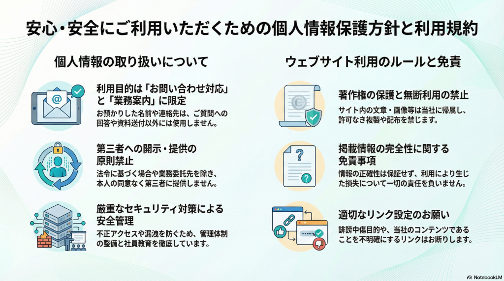 当社は、個人情報の漏洩・紛失・改ざんを防止するため、 適切な安全管理措置を講じます。